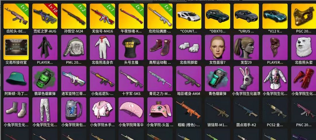 装备描述:---家里不要租 家里电脑玩不了--- 【六神器】全马丁6车漆/双兰博紫外线车漆/满级霓虹AUG/孙悟空M24/火麒麟M762/无信号M4/玩偶炮//午夜惊魂98K/彩烟/绷带AK/大金牙/熊脚/