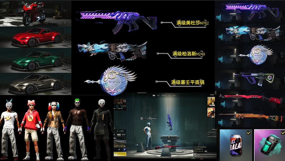 装备描述:家用不要租 不租家用【3满级6神器】马丁跑车/杜卡迪/双小丑/尼尔9S/满级美杜莎M762/满级柏洛斯M249/满级塞壬锅/霓虹AUG/夜曲M24/午夜98K/彩烟/烟枪/玩偶干扰包/黑鬼/大金牙/熊脚/染血裤/阿狸套/拉风龙套/发光套/小黄鸭套/汪汪队背包/塞壬套/牛角/滑雪镜/音响舞