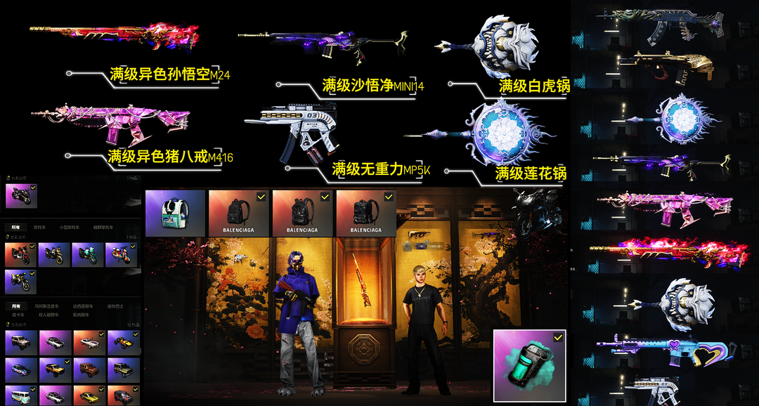 装备描述:---家里不要租 家里电脑玩不了--- 【6满级11神器】巴黎世家大礼包/杜卡迪/满级异色孙悟空/满级异色猪八戒/满级沙悟净/满级无重力mp5k/满级异色唐三藏/满级白虎锅/美杜莎762/暗影MK12/魔咒之力/弥诺AUG/青龙M762/大金牙/彩色烟雾弹/滑雪镜/西游记套装/爱的主打歌/黑鬼/染血裤
