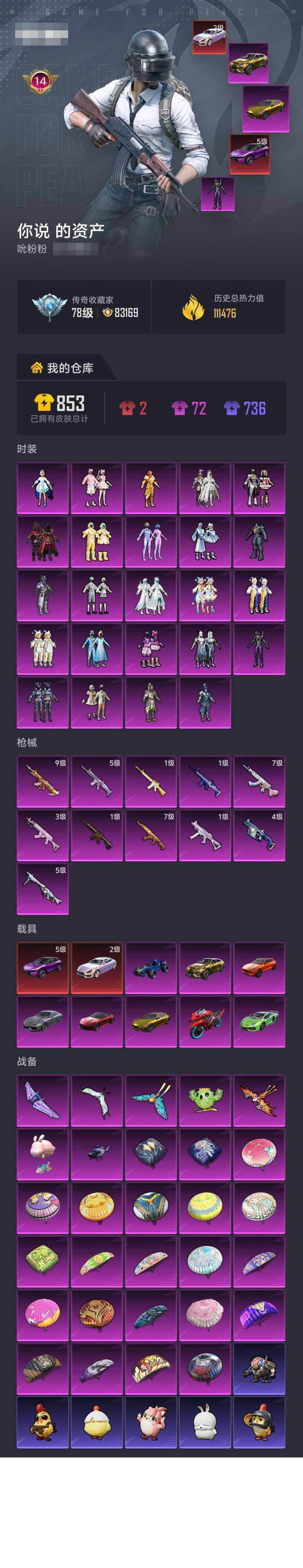 装备描述:速玩号!24粉装-11特效枪-12载具-5粉色飞行器-14王牌印记-191套装-217枪皮【红色载具】:路特斯ELETRE(电光紫)(五级),玛莎拉蒂Quattroporte(幻星粉)(二级)【热门品类】:粉装-雪国幻梦,粉装-梦幻火箭,套装-冥河战士,角色-军刀雅典娜,套装-胖达圆圆,套装-黄金大亨,套装-忍者信条,套装-动感兔斯基人偶服,套装-浪漫波比,套装-粉红小猪,M416-星际漫游【粉色套装】:粉装-幻影战神,粉装-宝贝奶油派,粉装-水曜玄武,粉装-金曜白虎,粉装-雪国幻梦,粉装-梦幻火箭,粉装-苍蓝魅影,粉装-冰霜白皇,粉装-炙焰红王,角色-洛天依,粉装-吟月归客,角色-初号机款机体服,粉装-蓝莓炮弹,粉装-甜心娃娃,粉装-精灵娃娃,粉装-酣梦娃娃,粉装-天之羽翼,粉装-岚岚物语,粉装-傲雪凌霜,粉装-垂柳戏鸭,粉装-灵感创作师,粉装-彩虹甜喵,粉装-盖世英雄【粉色枪皮等级】:AKM-甜心宝贝(七级),M16A4-垂柳戏鸭(一级),SCAR-L-梦幻火箭(五级),SCAR-L-青春物语(一级),M416-五爪金龙(一级)