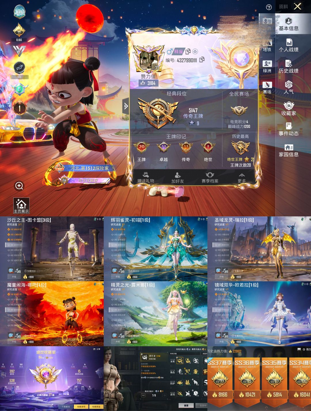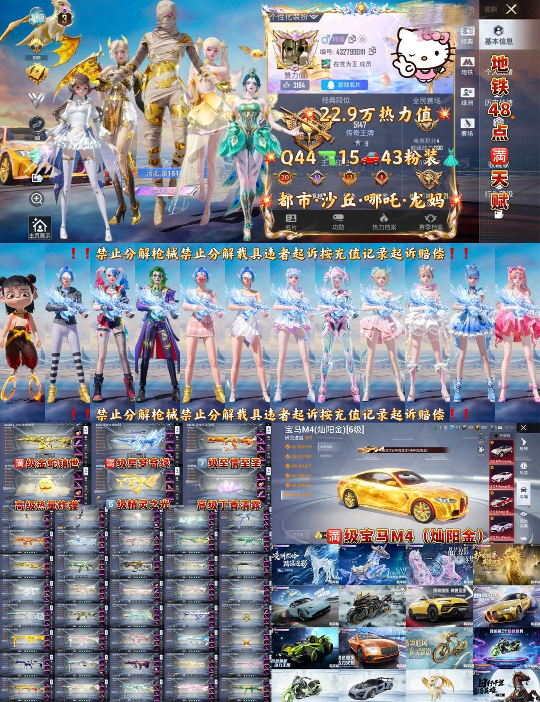 限制: 租号5次及以上 | 撤单率<40%才可租用此帐号装备描述:满级黄金宝马/满级星梦奇缘AUG/满级金蛇斯噶/7级至情至圣M4/3级木乃伊哪吒露米娜金鞋子/6红37粉44特14载具