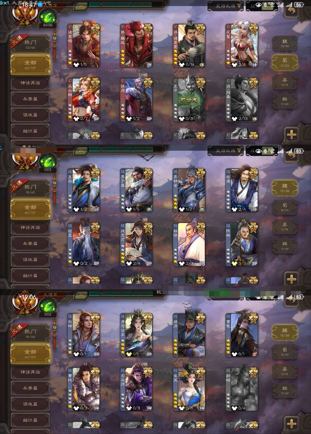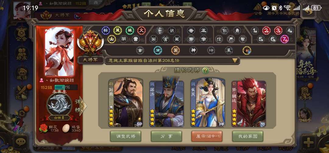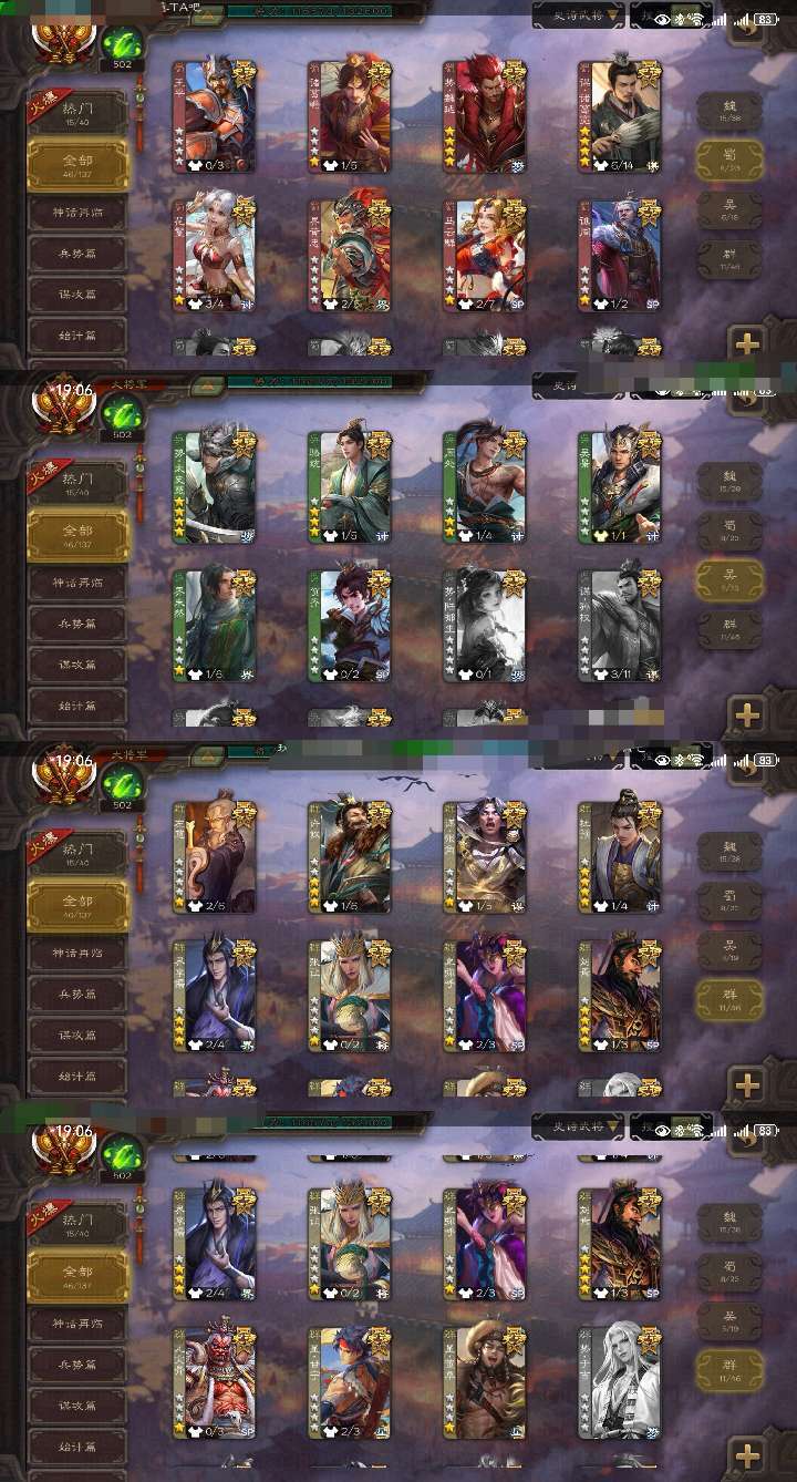 限制: 租号2次及以上 |装备描述:官方大将军,三卡齐全。 目前有几万豆子和几千菜篮子,只能打低倍场,全程监控,打高倍场或者乱砸菜篮别怪我立马顶号并永久拉黑! 崔芙 蒋济 势魏延 势太史慈 动刘焉 曹髦 动清河公主 谋诸葛亮 动杜预 星董卓花髪 等领衔46史诗大将军