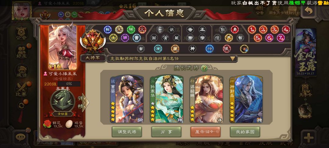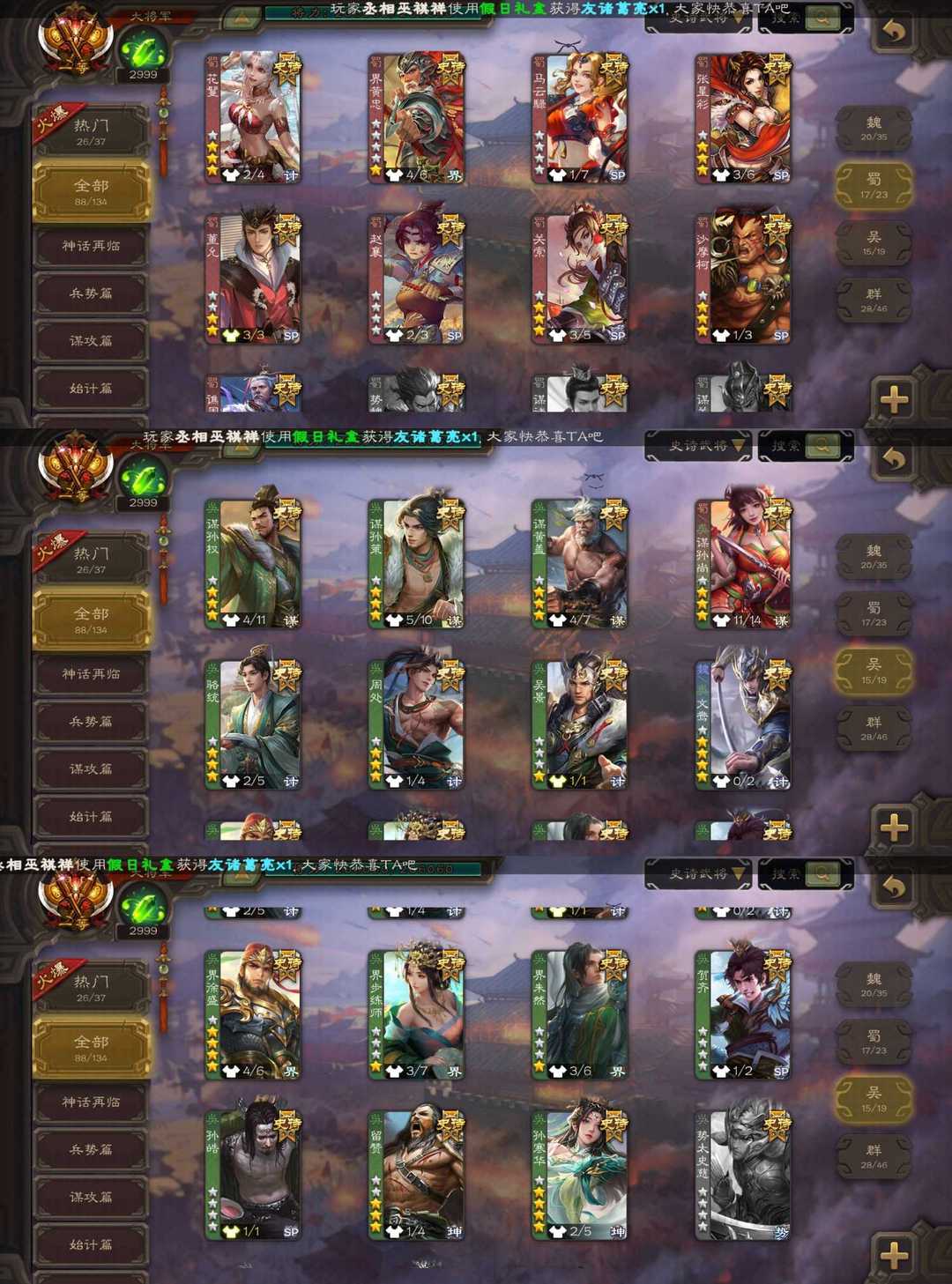 限制: 租号1次及以上 |装备描述:魏:文鸯 马钧 谋曹操 谋曹仁 双形态界钟会 蜀:谋夏侯氏 谋刘备 谋孙尚香 吴:天子令谋孙策 谋孙权 界徐盛 孙寒华 留赞 谋黄盖 群:动态谋貂蝉 杜预 界沮授 动态刘焉 十常侍 南华老仙 祢衡 神:动态神甘宁 双形态神郭嘉 动态神太史慈 动态神孙策 神荀彧 神赵云