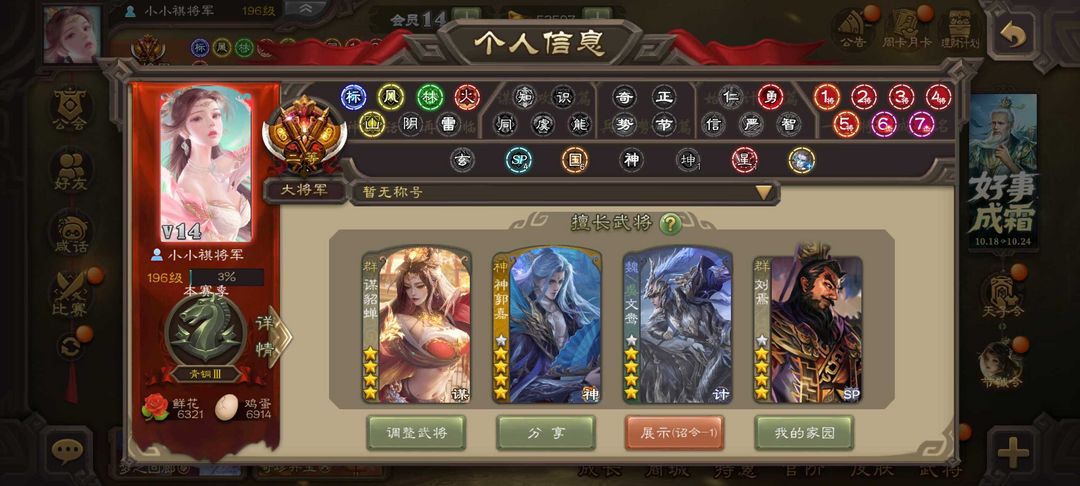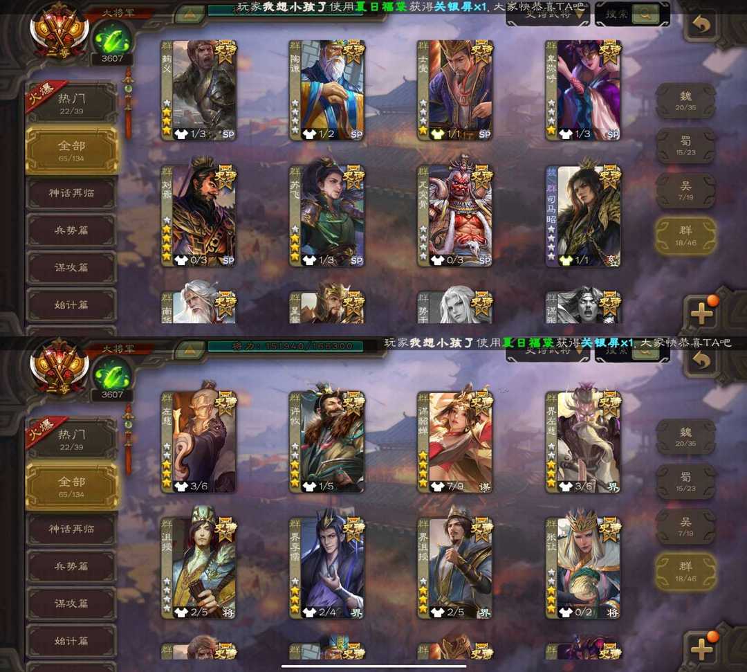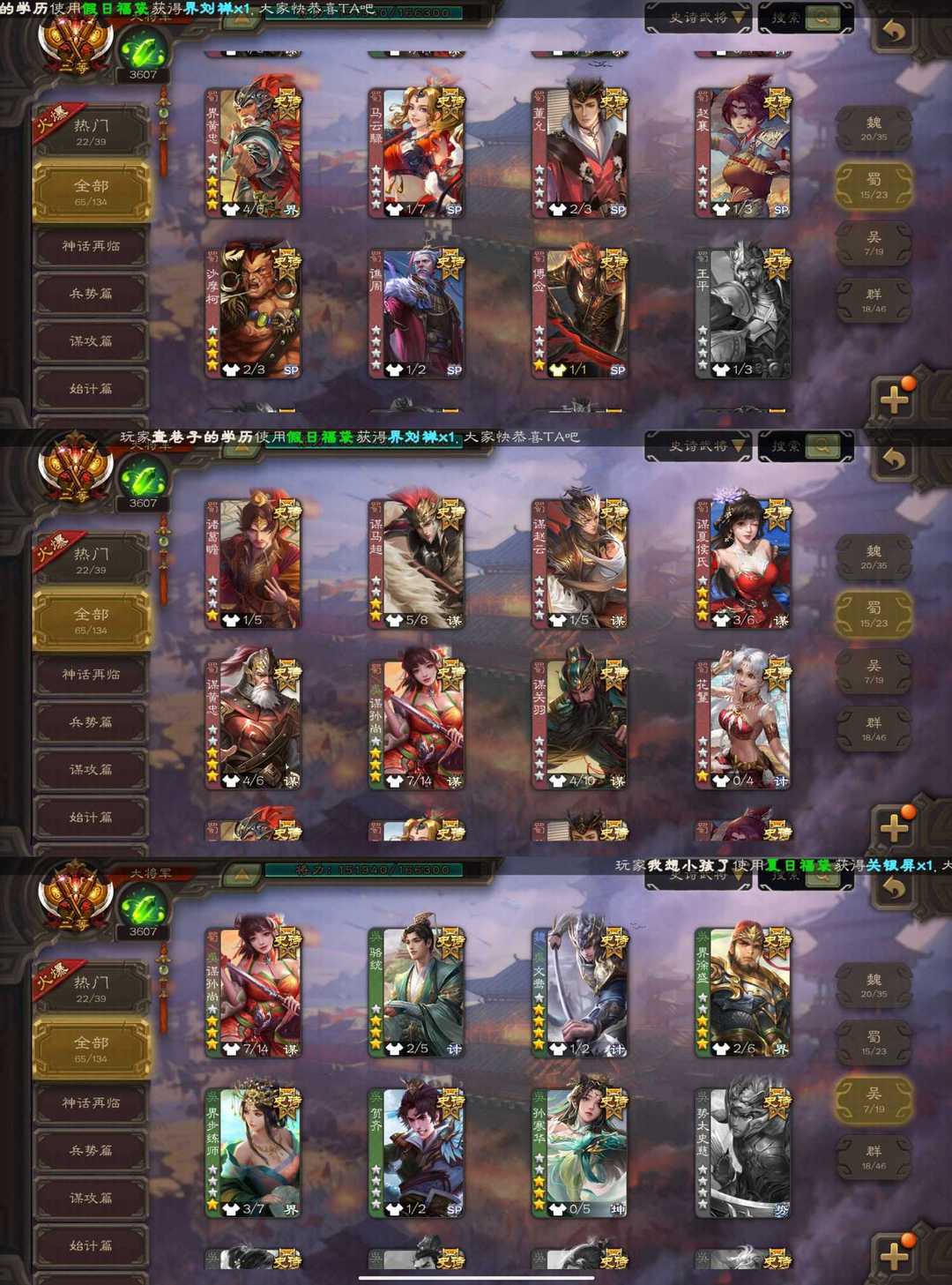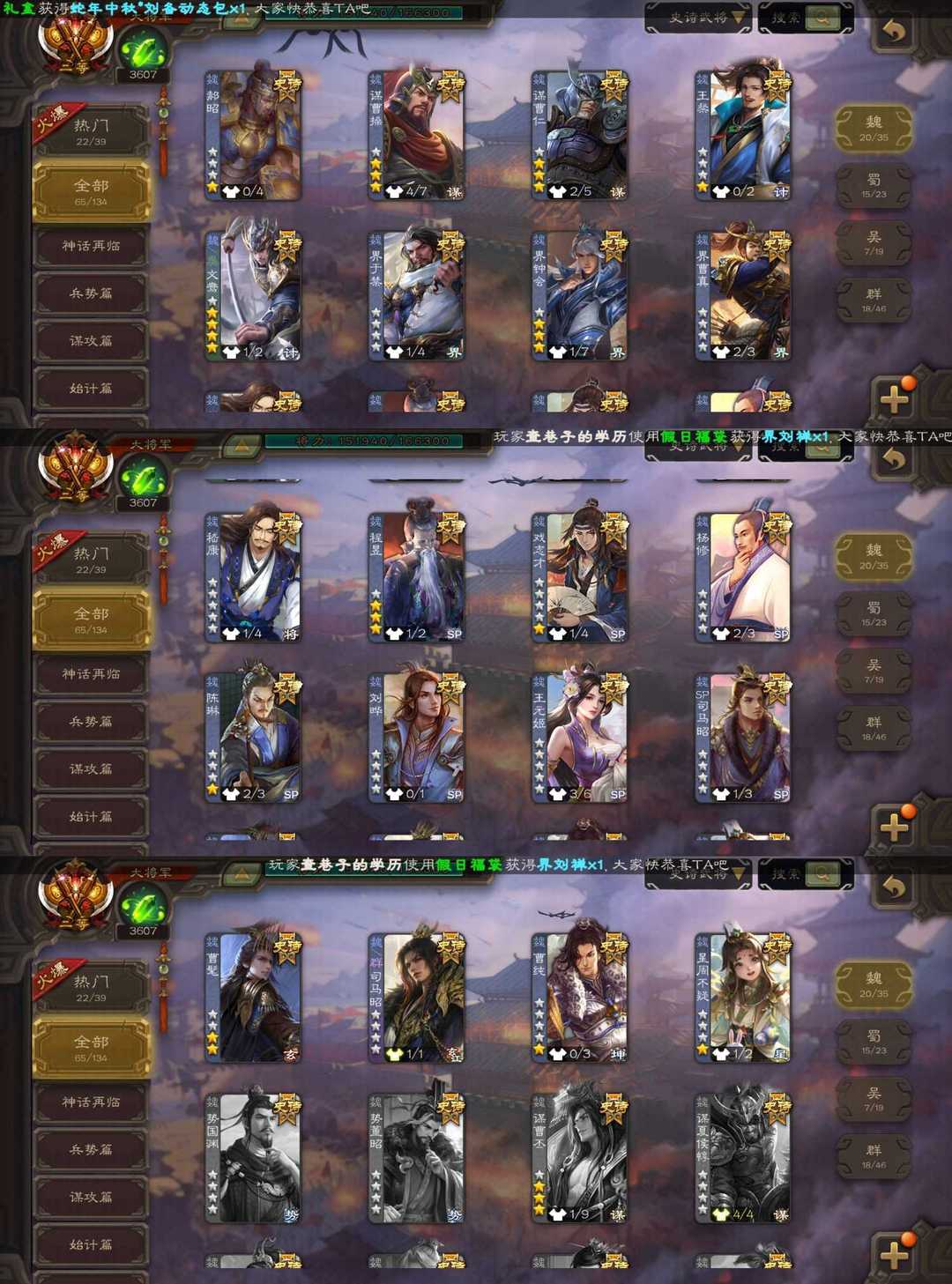 装备描述:魏:曹髦 动态谋曹操 界钟会 动态文鸯 双形态司马昭 蜀:动态谋关羽 动态谋黄忠 谋孙尚香 谋夏侯氏 吴:界徐盛 孙寒华 群:动态谋貂蝉 界沮授 刘焉 南华老仙 神:双形态神郭嘉 神孙策 神荀彧 神太史慈 动态神甘宁