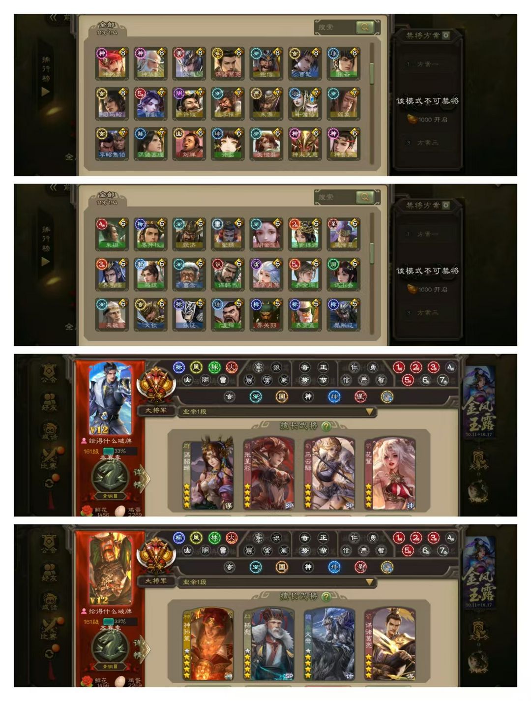 限制: 撤单率<19%才可租用此帐号装备描述:官方三等大将军,有卡,VIP12! 12四星玉龙:回廊动文鸯,回廊动神孙策,回廊动杨彪,回廊动张星彩,动谋诸葛亮动花鬘,金谋貂蝉! 51史诗大将军:回廊动杜预,回廊动界徐盛,回廊动神太史慈,动司马昭动界李儒,动神赵云动谋黄月英动留赞动戏志才,曹髦张奋十常侍界沮授神鲁肃神华佗神郭嘉羊徽瑜界左慈,鲍信阎象王元姬曹婴界钟会郭女王! 113排位武将,35动皮80金皮180国战皮肤!