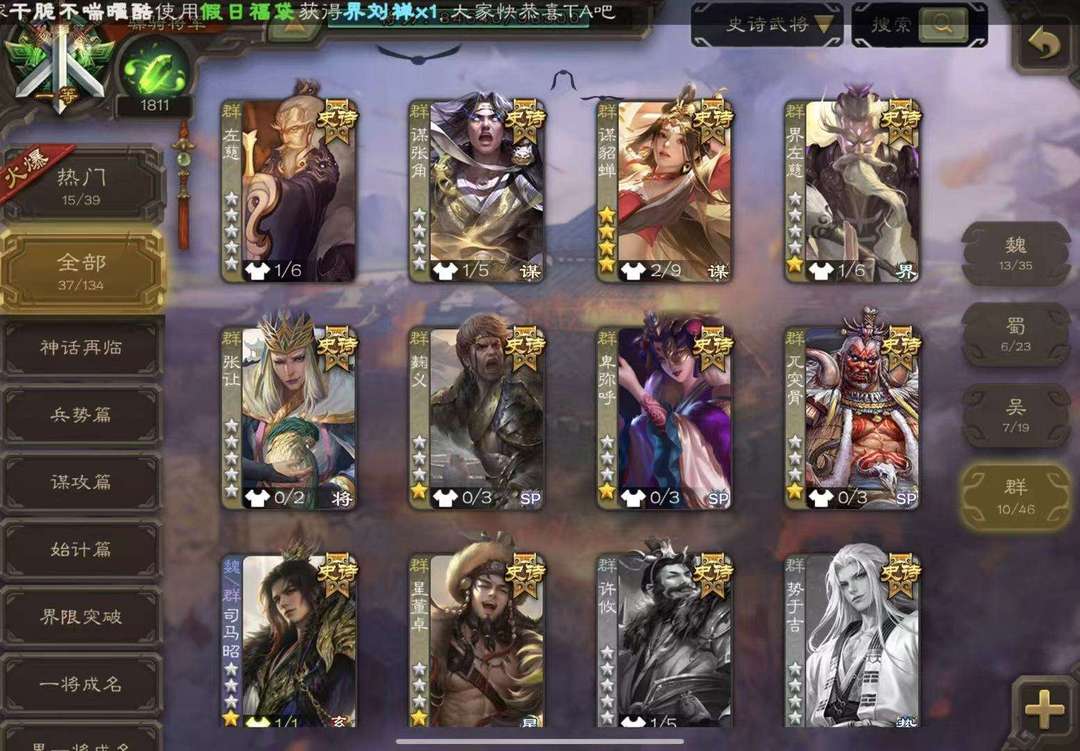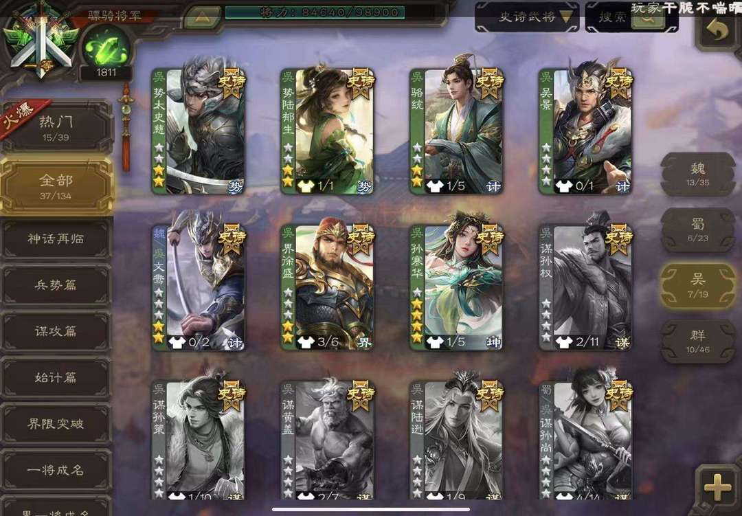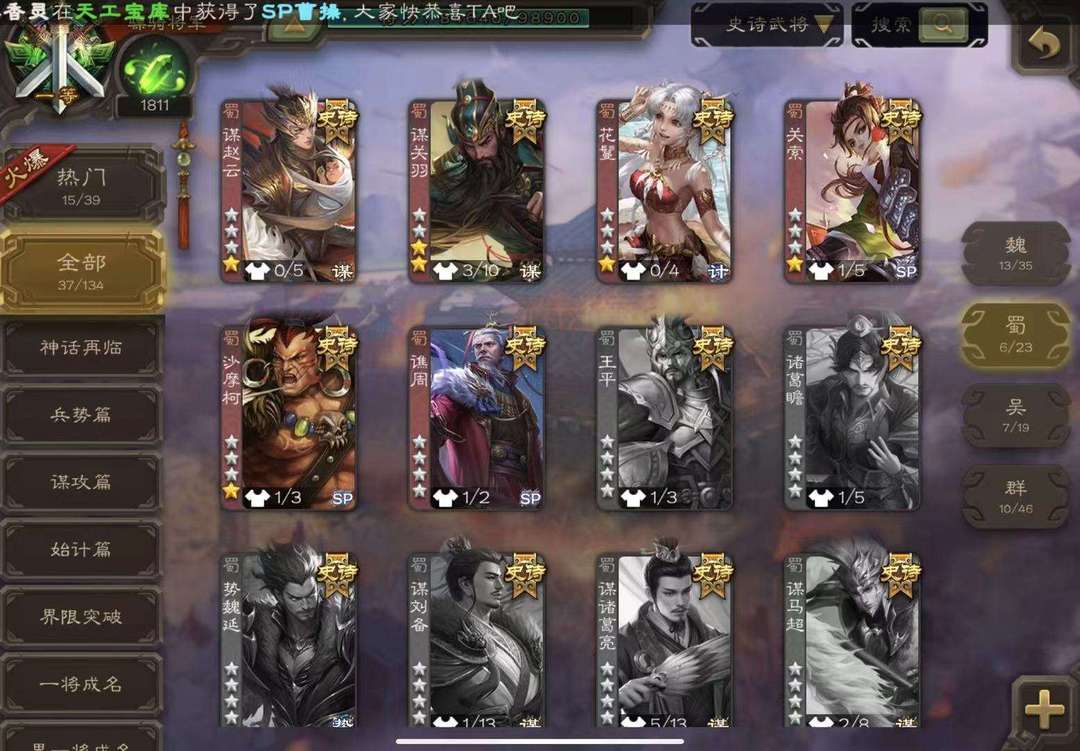 装备描述:[有卡]-动态神司马懿-势国渊-动态谋关羽-曹髦-势太史慈-文鸯-动态孙寒华-动态谋貂蝉-清河公主-司马昭-羊徽瑜等多优质史诗