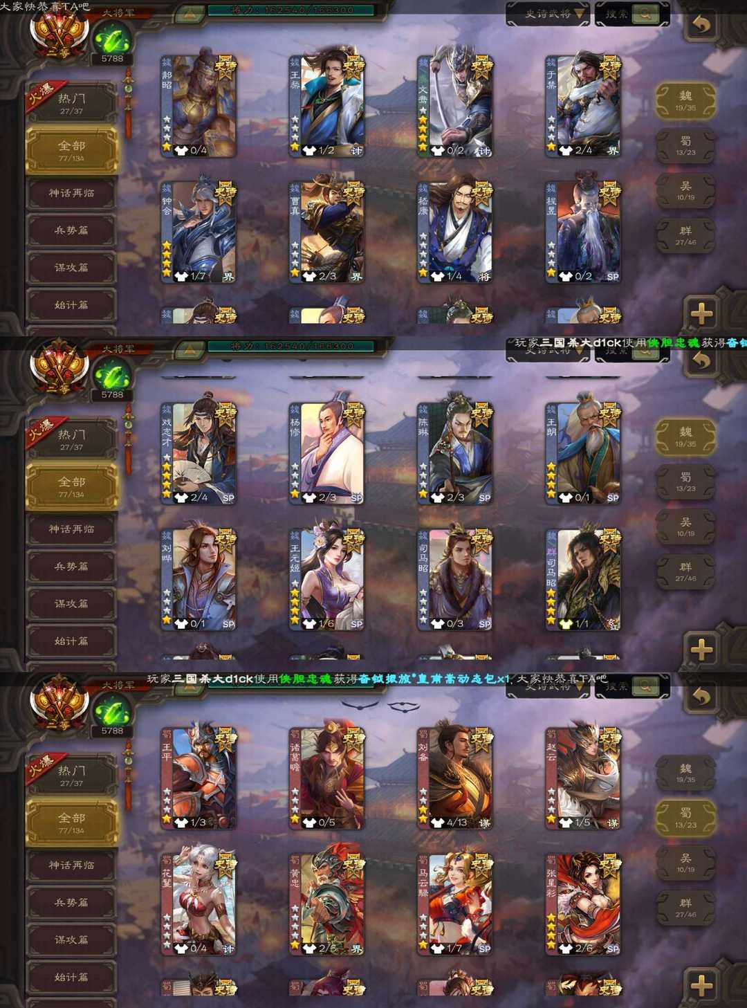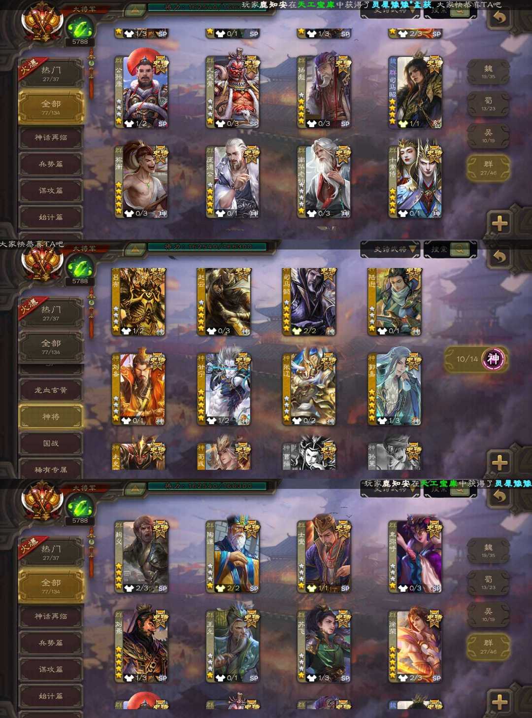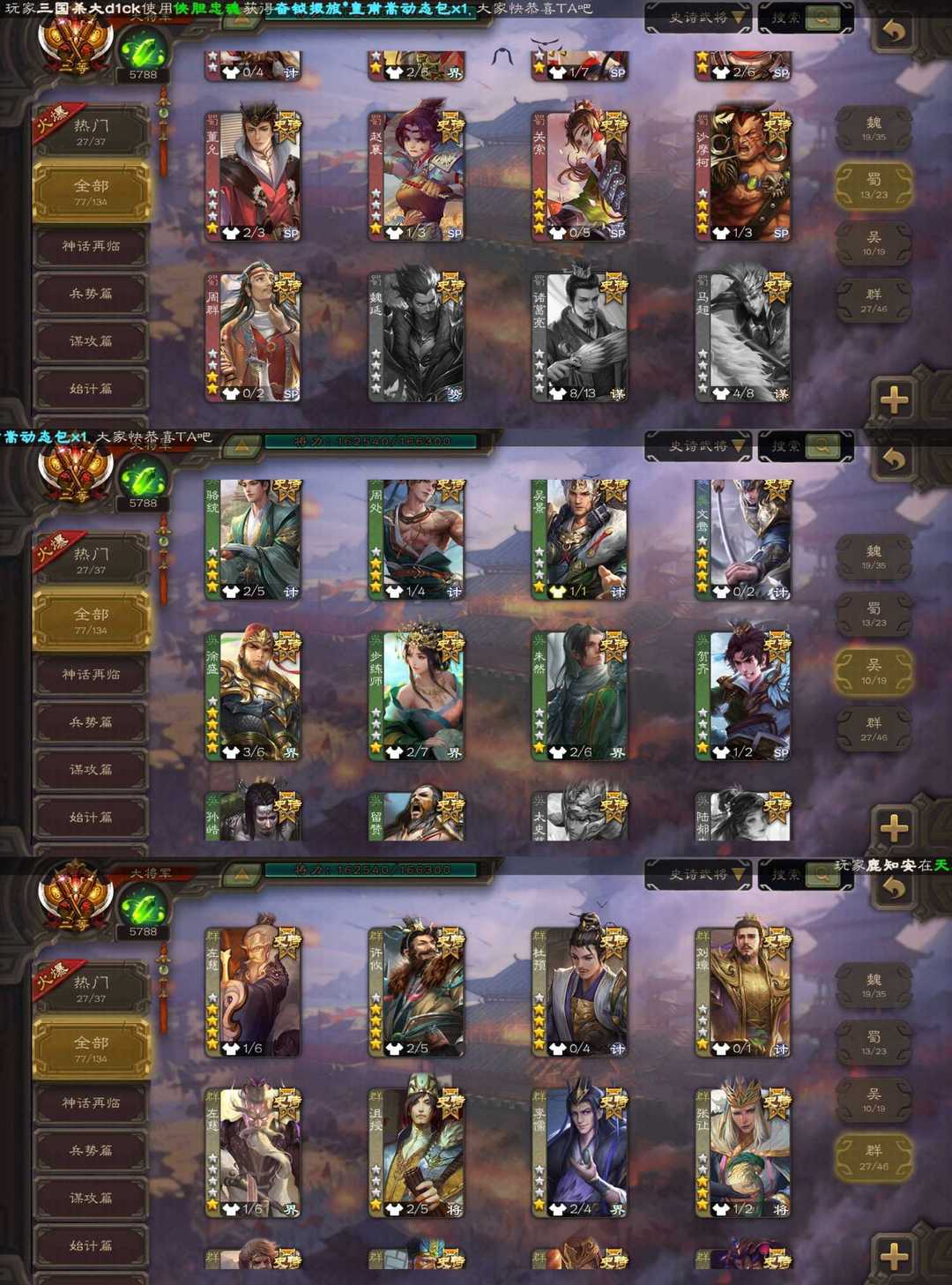装备描述:魏:文鸯 界钟会 双形态司马昭 马钧 蜀:谋刘备 谋赵云 界黄忠 吴:动态界徐盛 留赞 群:杜预 刘璋 动态刘焉 动态徐荣 杨彪 祢衡 南华老仙 十常侍 神:动态神司马懿 动态神郭嘉 动态神甘宁 动态神荀彧 神太史慈
