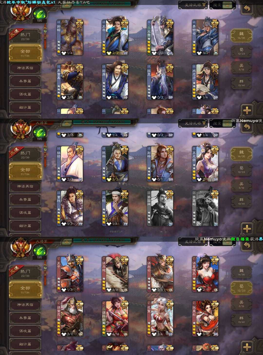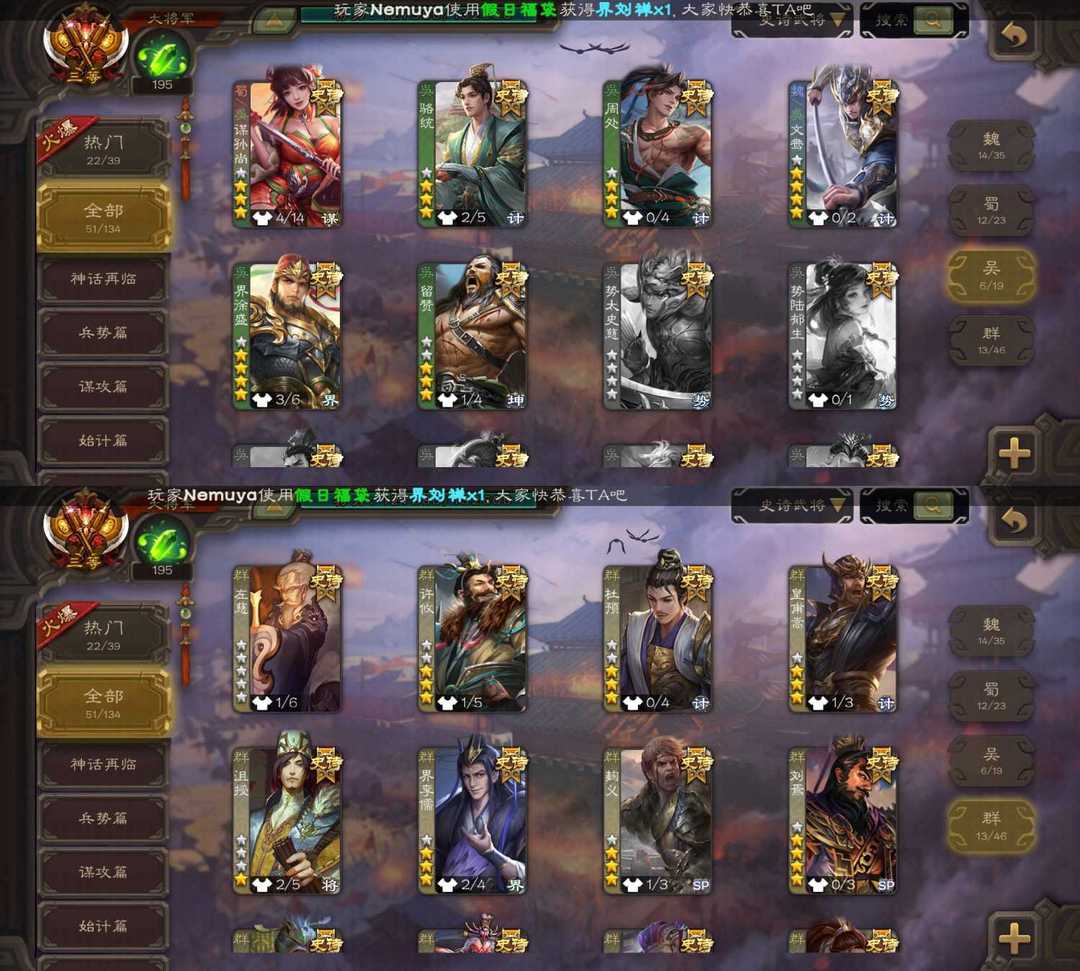 装备描述:魏:文鸯 动态界钟会 马钧 蜀:谋黄忠 谋夏侯氏 谋孙尚香 傅佥 吴:留赞 界徐盛 群:杜预 刘焉 祢衡 杨彪 神:动态神荀彧 动态神郭嘉 动态神甘宁 神孙策 神太史慈